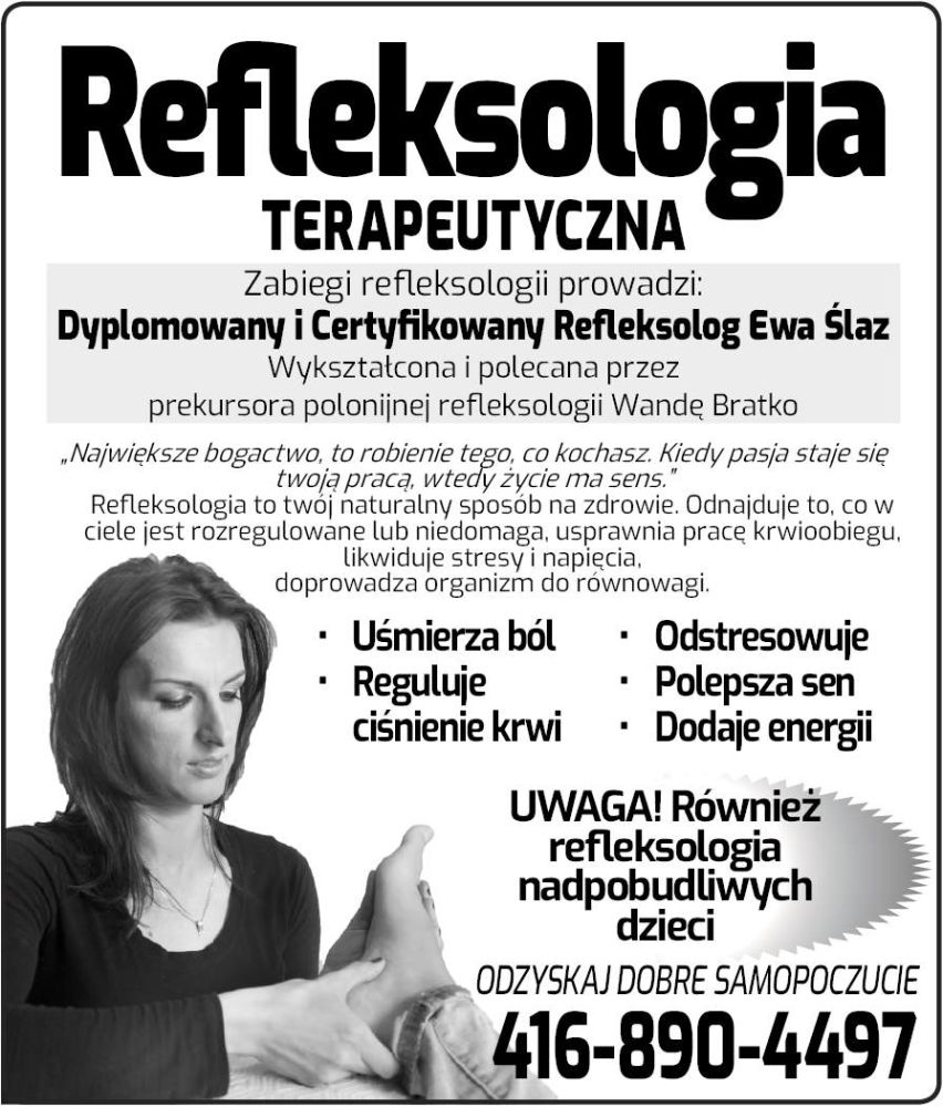 Największe bogactwo, to robienie tego, co kochasz. Kiedy pasja staje się twoją pracą, wtedy życie ma sens.” Refleksologia to twój naturalny sposób na zdrowie. Odnajduje to, co w ciele jest rozregulowane lub niedomaga, usprawnia pracę krwioobiegu, likwiduje stresy i napięcia, doprowadza organizm do równowagi. Uśmierza ból Reguluje ciśnienie krwi Odstresowuje Polepsza sen Dodaje energii UWAGA! Również refleksologia nadpobudliwych dzieci ODZYSKAJ DOBRE SAMOPOCZUCIE 416-890-4497
