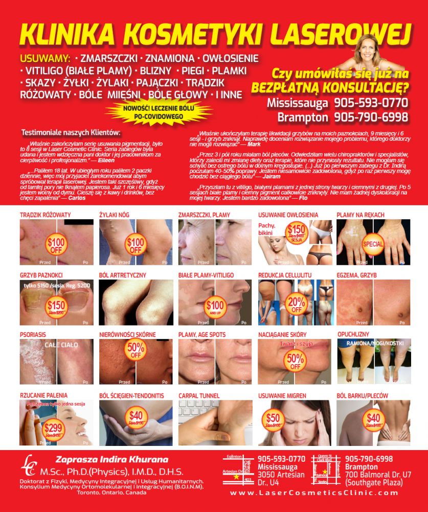 Klinika Kosmetyki Laserowej USUWAMY: • ZMARSZCZKI • ZNAMIONA • VITILIGO (BIAŁE PLAMY) • OWŁOSIENIE • BLIZNY • PIEGI • PLAMKI • SKAZY • ŻYŁKI • ŻYLAKI • PAJĄCZKI • TRĄDZIK RÓŻOWATY • BÓLE MIIĘŚNI, GŁOWY • I INNE